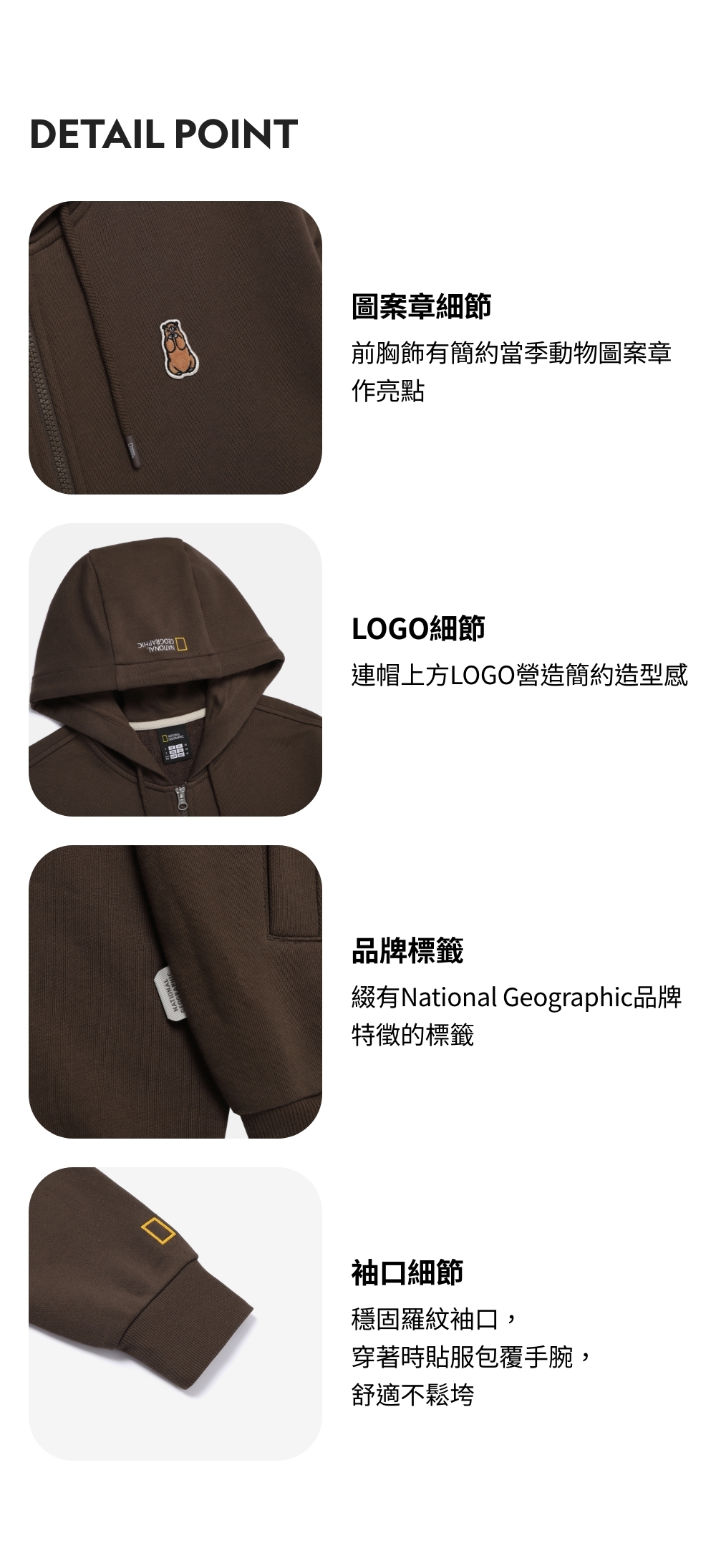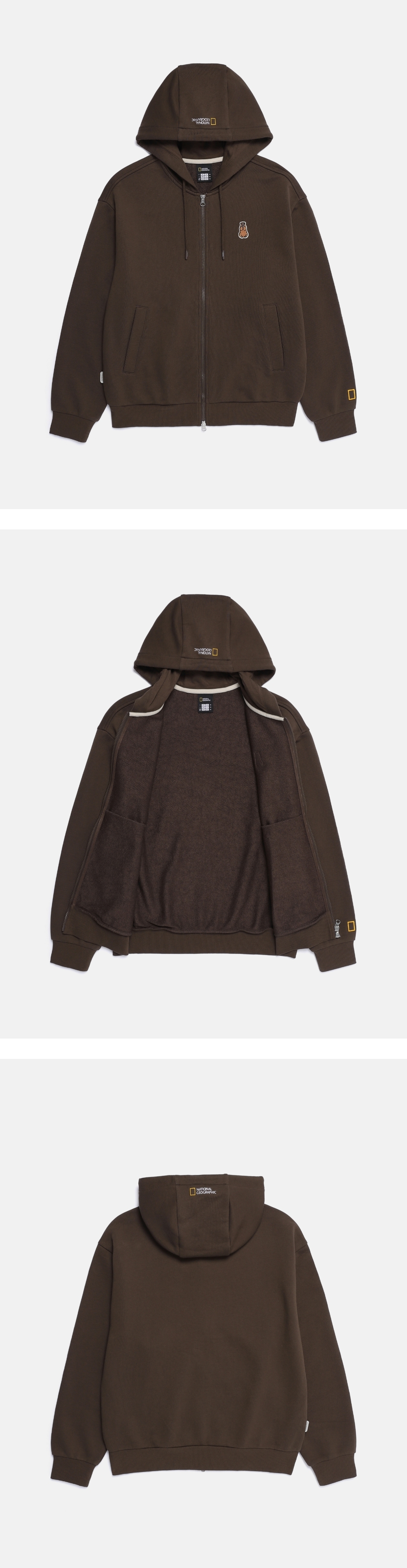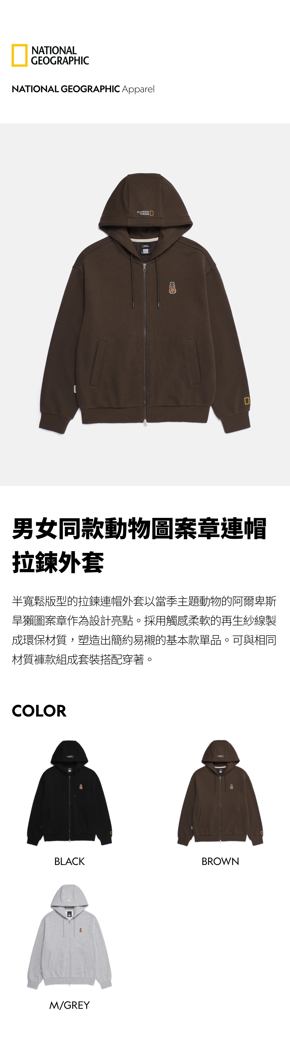 半寬鬆版型的拉鍊連帽外套以當季主題動物的阿爾卑斯旱獺圖案章作為設計亮點。
