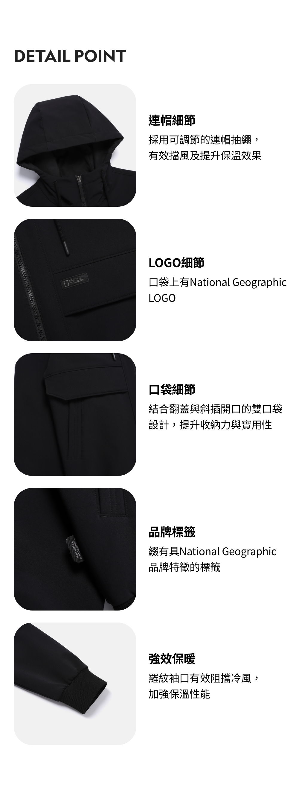 採用可調節的連帽抽繩,有效擋風及提升保溫效果