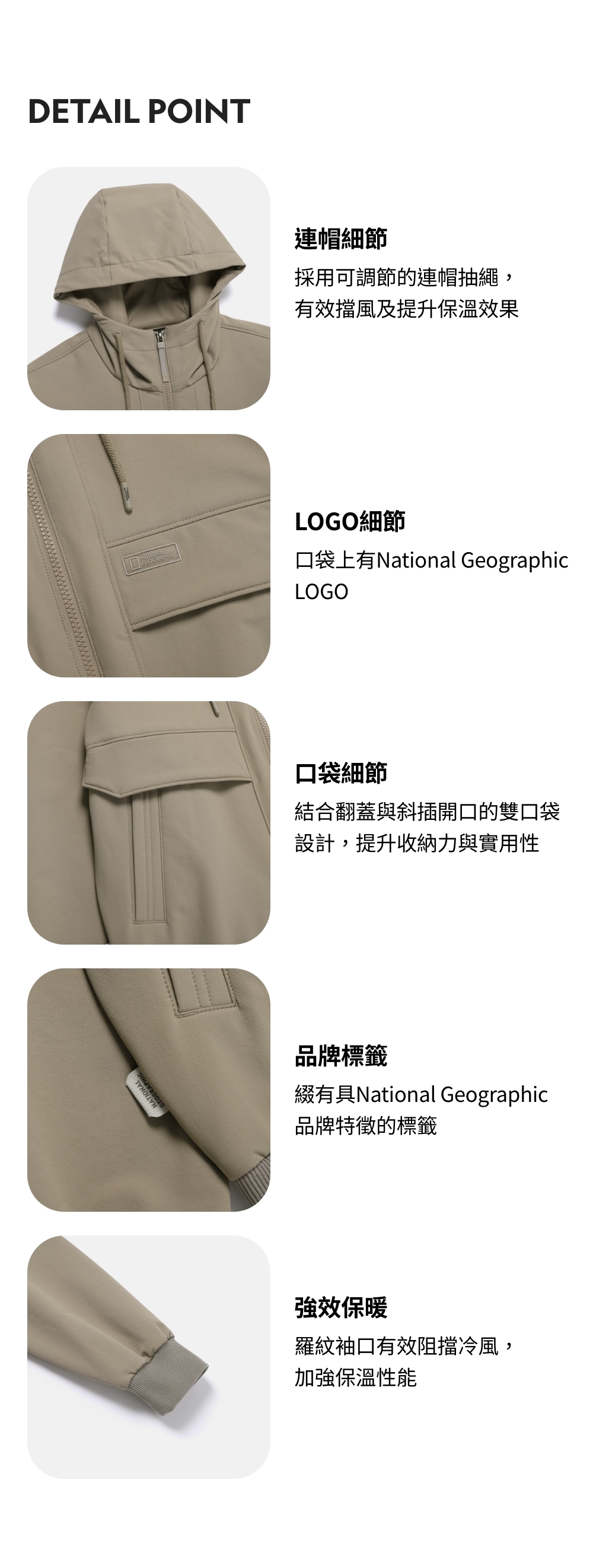 採用可調節的連帽抽繩,有效擋風及提升保溫效果