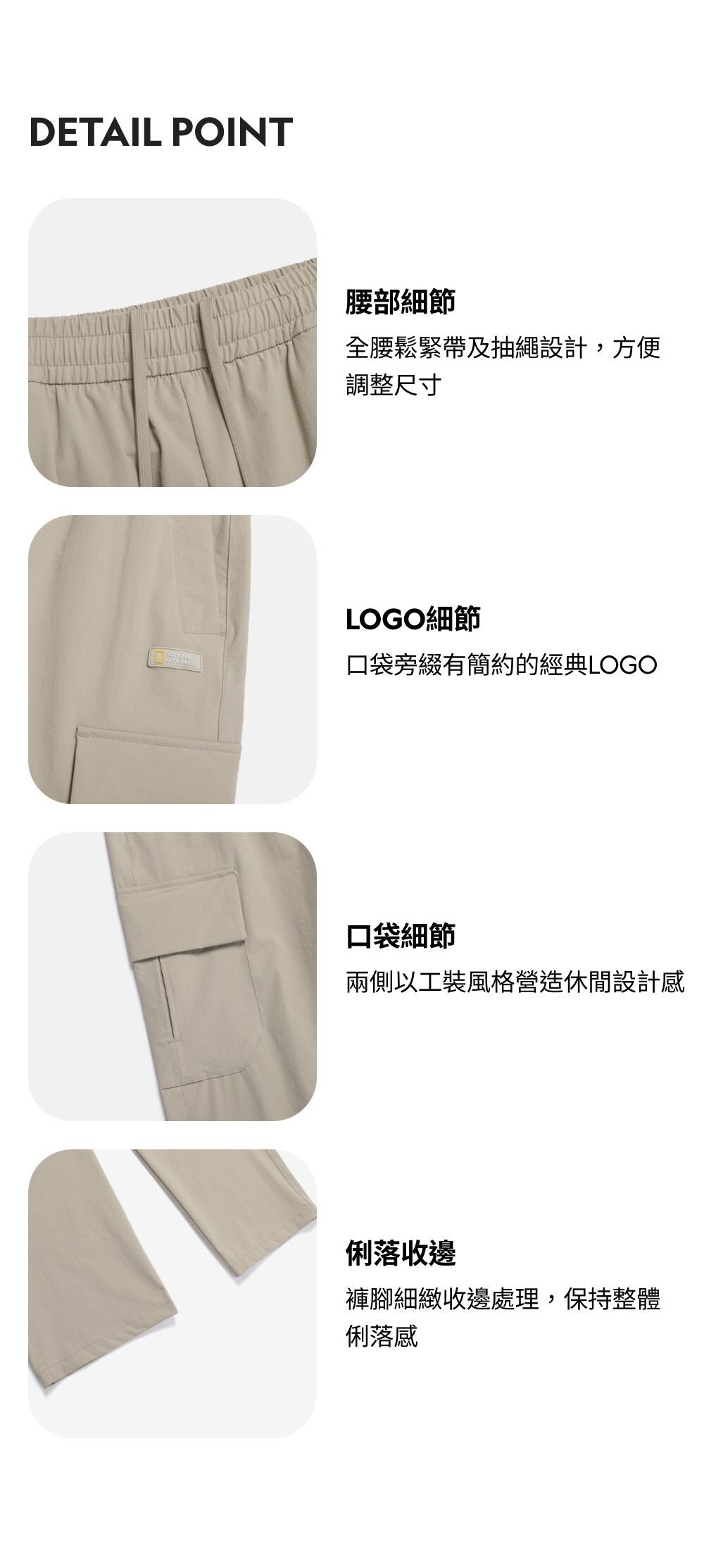 -口袋細節:兩側以工裝風格營造休閒設計感