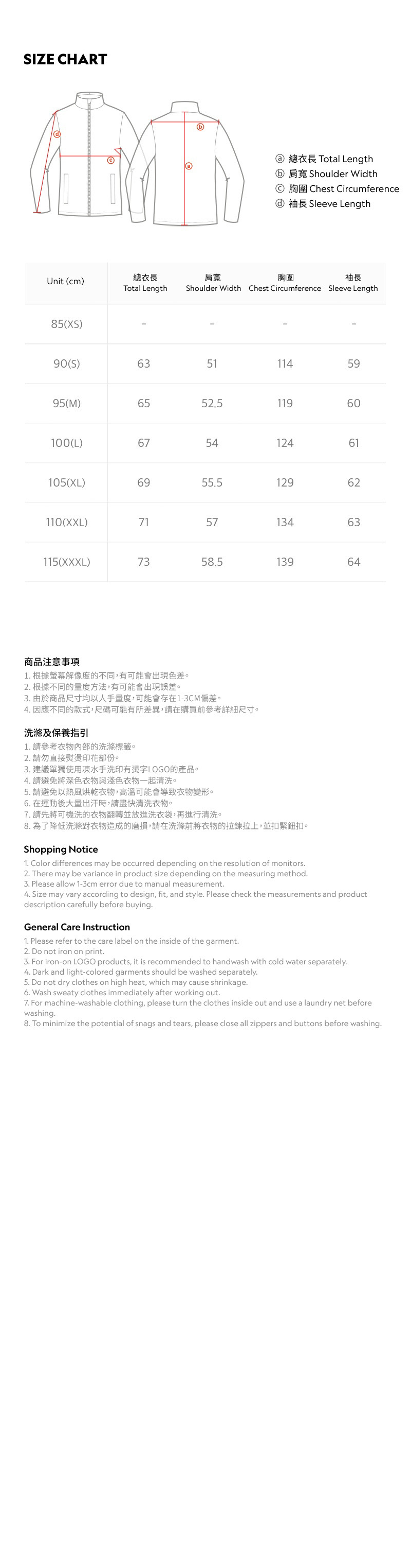 - 鬆緊帶袖口,連帽及衣襬均有抽繩方便調節