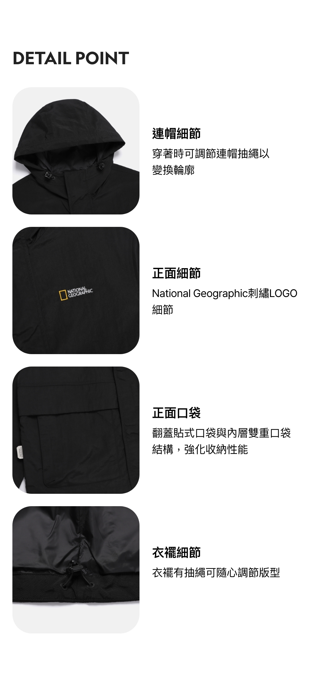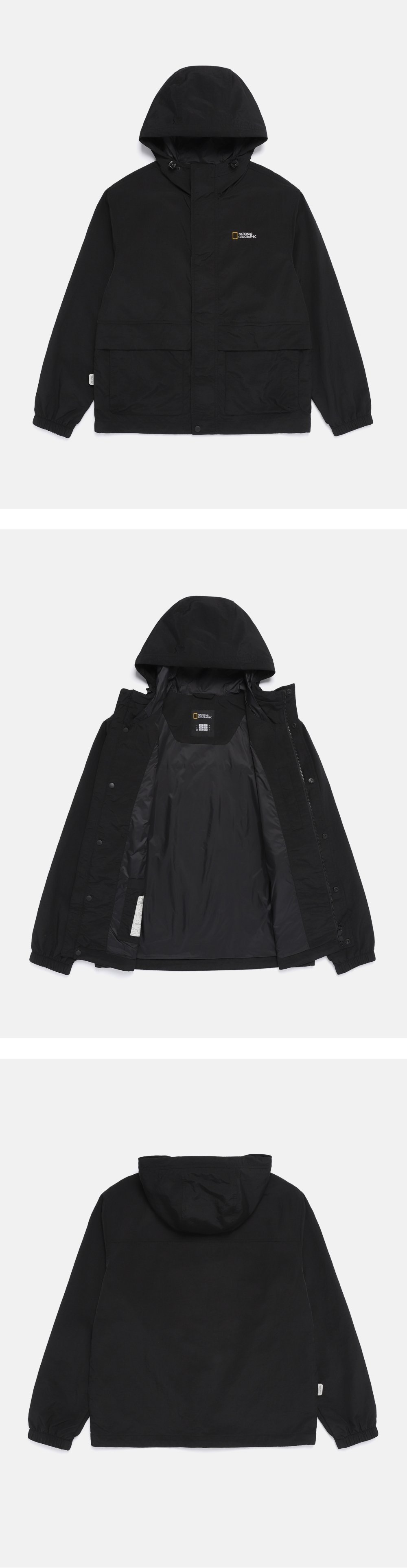 外套採用斜紋Taslan材質,輕盈且具有沙沙作響的質感。布料呈現棉質外觀的自然皺褶感,營造出自在隨性的時尚風格。翻蓋貼式口袋與內層雙重口袋結構,強化收納性能。連帽及衣襬均有抽繩,可提升版型調節能力與活動自由度。